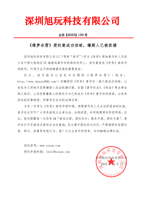 深圳旭玩科技有限公司(以下简称“我司”)作为《传奇》原始著作权人亚拓士在中国大陆地区PC端游戏著作权的维权权利人,肩负着规范《传奇》游戏市场秩序,引领行业可持续健康发展的重要使命。