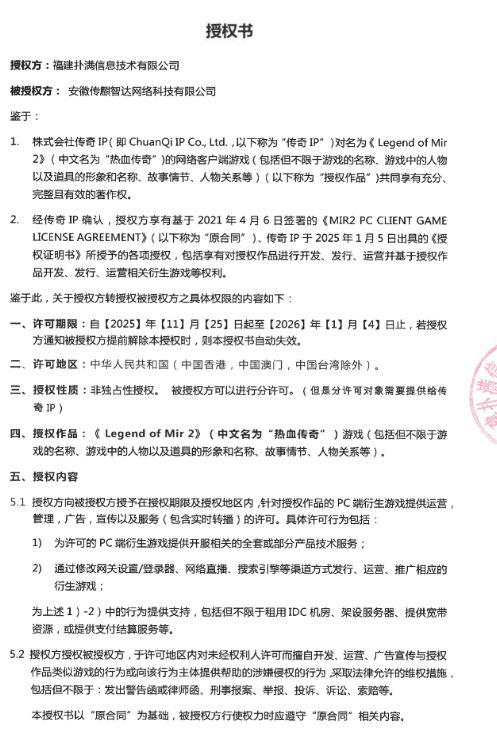 经传奇IP授权RENAISSANCE INVESTMENT MANAGEMENT LIMITED (以下简称 RENAISSANCE Ltd.)有权在中国大陆地区独占性地对授权作品的简体中文版网络客户端游戏进行开发、发行、运营和广告宣传并基于授权作品开发、运营、管理相关衍生游戏等,针对授权作品的侵权游戏及侵权方,RENAISSANCE Ltd.有权采取必要的措施,并有权将前述权利分授权给第三人。授权方福建扑满信息技术有限公司经RENAISSANCELtd.授权,且经传奇IP确认,获得上述权利,且有权将上述权利分授权给第三人。