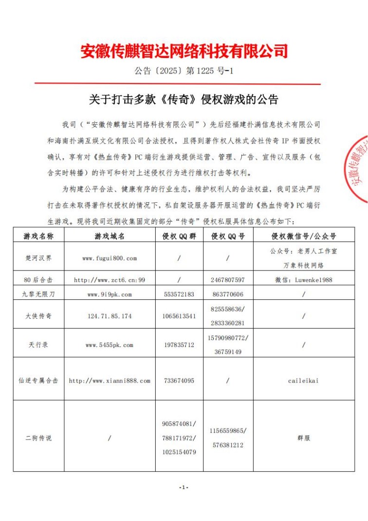 安徽传麒智达-关于打击多款《传奇》侵权游戏的公告