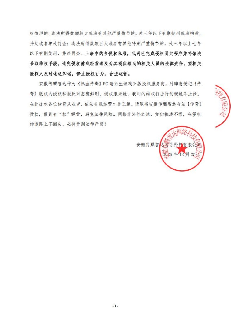 安徽传麒智达作为《热血传奇》PC端衍生游戏正版授权服务商,对肆意侵犯《传奇》版权的侵权私服反对态度鲜明,侵权服未绝,我司的维权打击行动就绝不止步。在此提示各位传奇从业者,依法合规运营才是正道,请取得安徽传麒智达合法《传奇》授权,做到有“权”经营,避免法律风险。网络非法外之地,如仍执迷不悟,在侵权的道路上不回头,必将受到法律严惩!