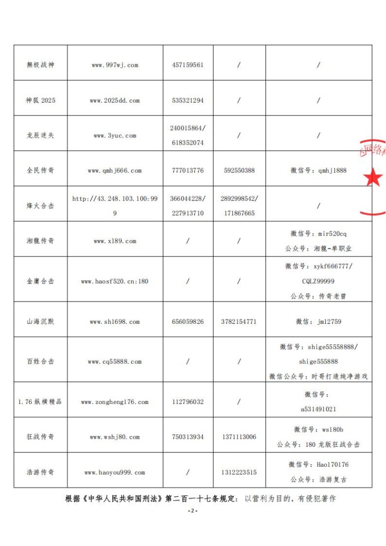 为构建公平合法、健康有序的行业生态,维护权利人的合法权益,我司坚决严厉打击在未取得著作权授权的情况下,私自架设服务器开服运营的《热血传奇》PC端衍生游戏。现将我司近期收集固定的部分“传奇”侵权私服具体信息公布如下: