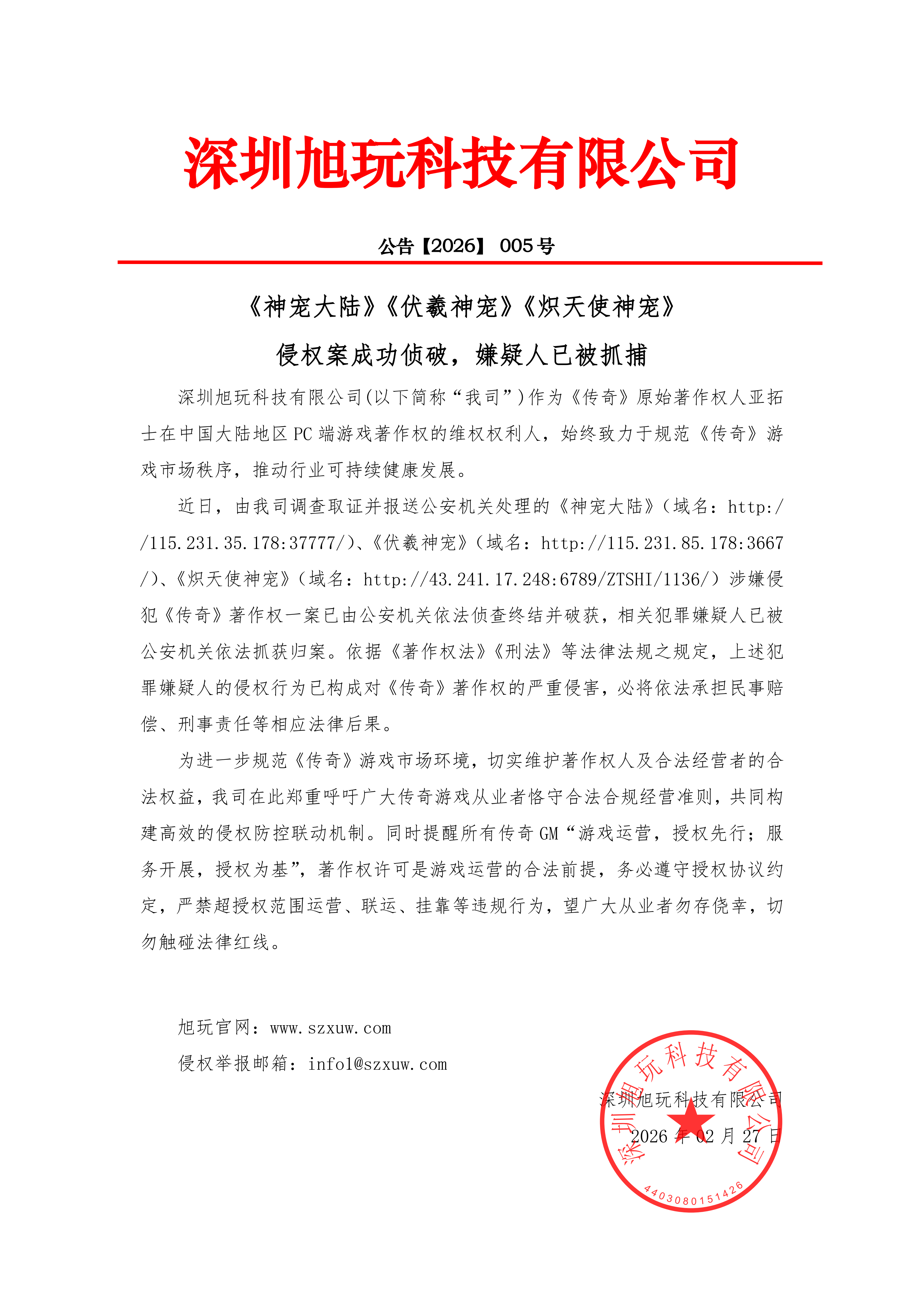 2026-02-27 16:55:47深圳旭玩科技有限公司(以下简称“我司”)作为《传奇》原始著作权人亚拓士在中国大陆地区PC端游戏著作权的维权权利人,始终致力于规范《传奇》游戏市场秩序,推动行业可持续健康发展。