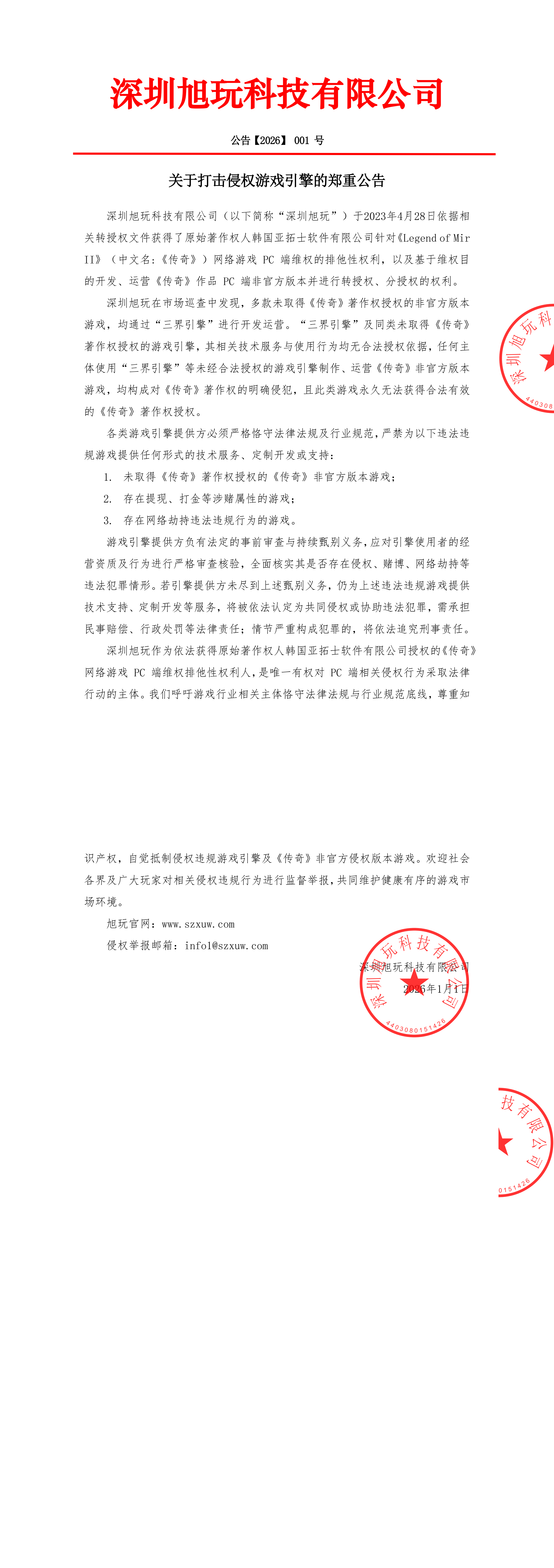 深圳旭玩作为依法获得原始著作权人韩国亚拓士软件有限公司授权的《传奇》网络游戏 PC 端维权排他性权利人,是唯一有权对 PC 端相关侵权行为采取法律行动的主体。我们呼吁游戏行业相关主体恪守法律法规与行业规范底线,尊重知识产权,自觉抵制侵权违规游戏引擎及《传奇》非官方侵权版本游戏。欢迎社会各界及广大玩家对相关侵权违规行为进行监督举报,共同维护健康有序的游戏市场环境。