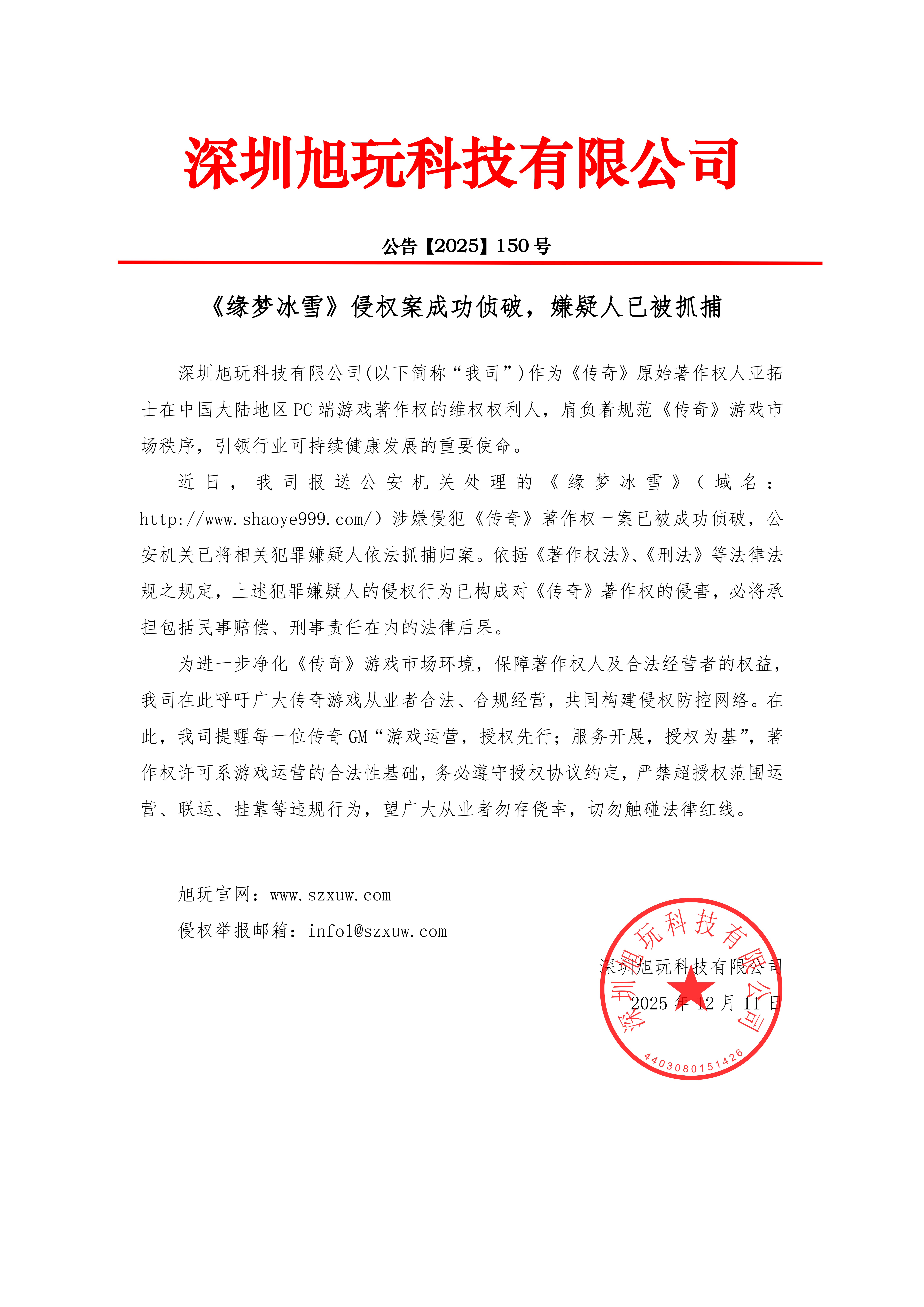 深圳旭玩科技有限公司(以下简称“我司”)作为《传奇》原始著作权人亚拓士在中国大陆地区PC端游戏著作权的维权权利人,肩负着规范《传奇》游戏市场秩序,引领行业可持续健康发展的重要使命。