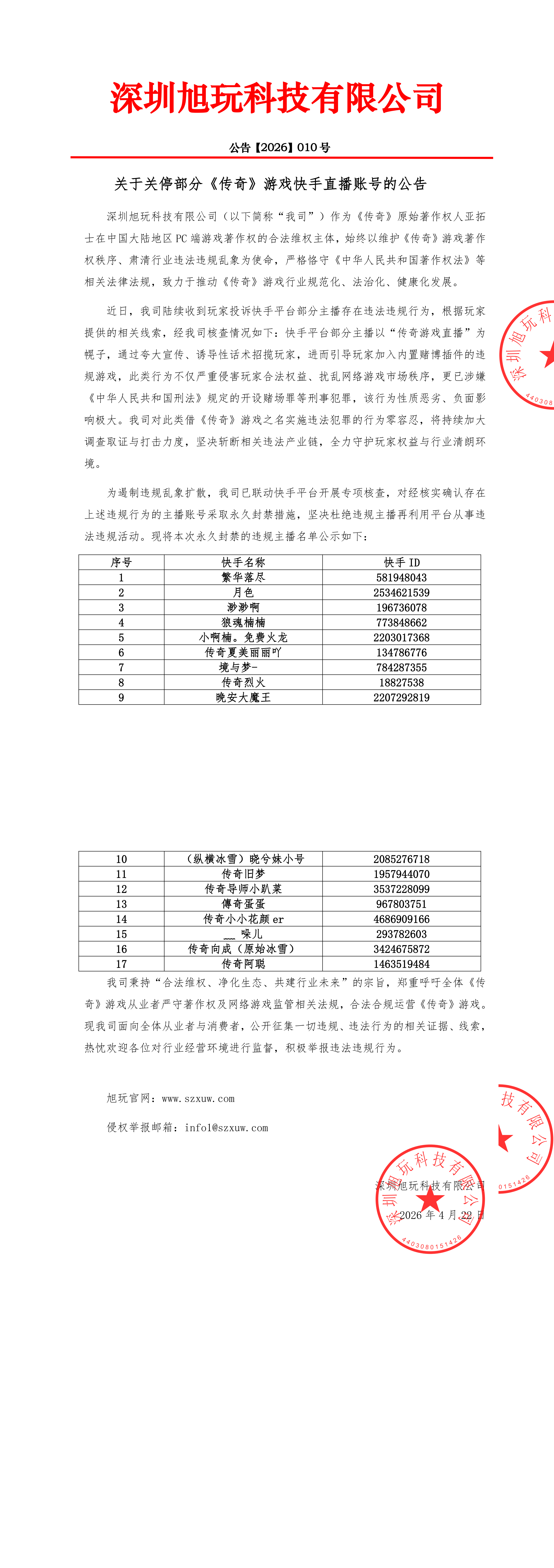 关于关停部分《传奇》游戏快手直播账号的公告
